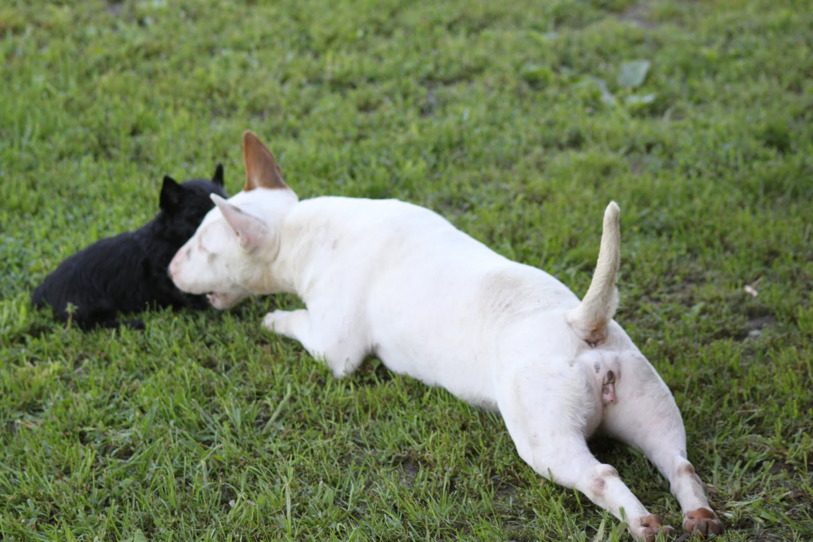 Már régóta tudom, hogy Afró a világ leglelkiismeretesebb mamája, de hogy gyerekei is örökölték ezt a tulajdonságát, azt nem gondoltam volna. Jelenleg van egy hatalmas Skót Terrier almom, ami hét tökmagot foglal magába. Ők most hat hetesek, szóval abban a korban vannak, amikor lerágják az ember haját is. Minden időmet lefoglalják, de így sem sikerül teljesen lefárasztanom őket. Feladtam a küzdelmet, s gondoltam, lesz ami lesz. Összeengedem őket a többi kutyával. Ekkor ismét egy olyan hatalmas szeretet és a másikkal való törödés járta át a kertet, hogy teljesen meghatódtam. Csülök, Babe, Harmi olyan szeretettel godoskodott a kicsikről, mindha tapasztalatuk lenne a gyereknevelésben. Döbbenetes volt. Ime néhány kép a kis haramiákról, ahogy kínozzák a bullokat.